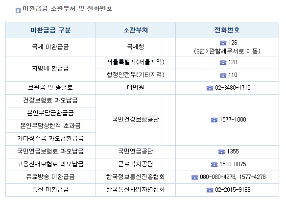 참고로, 아래 표와 같이 세금별, 환급금별 각 홈페이지를 통해 조회 서비스를 이용할 수 있습니다. 각 기관별 정보 및 연락처 참고하세요~